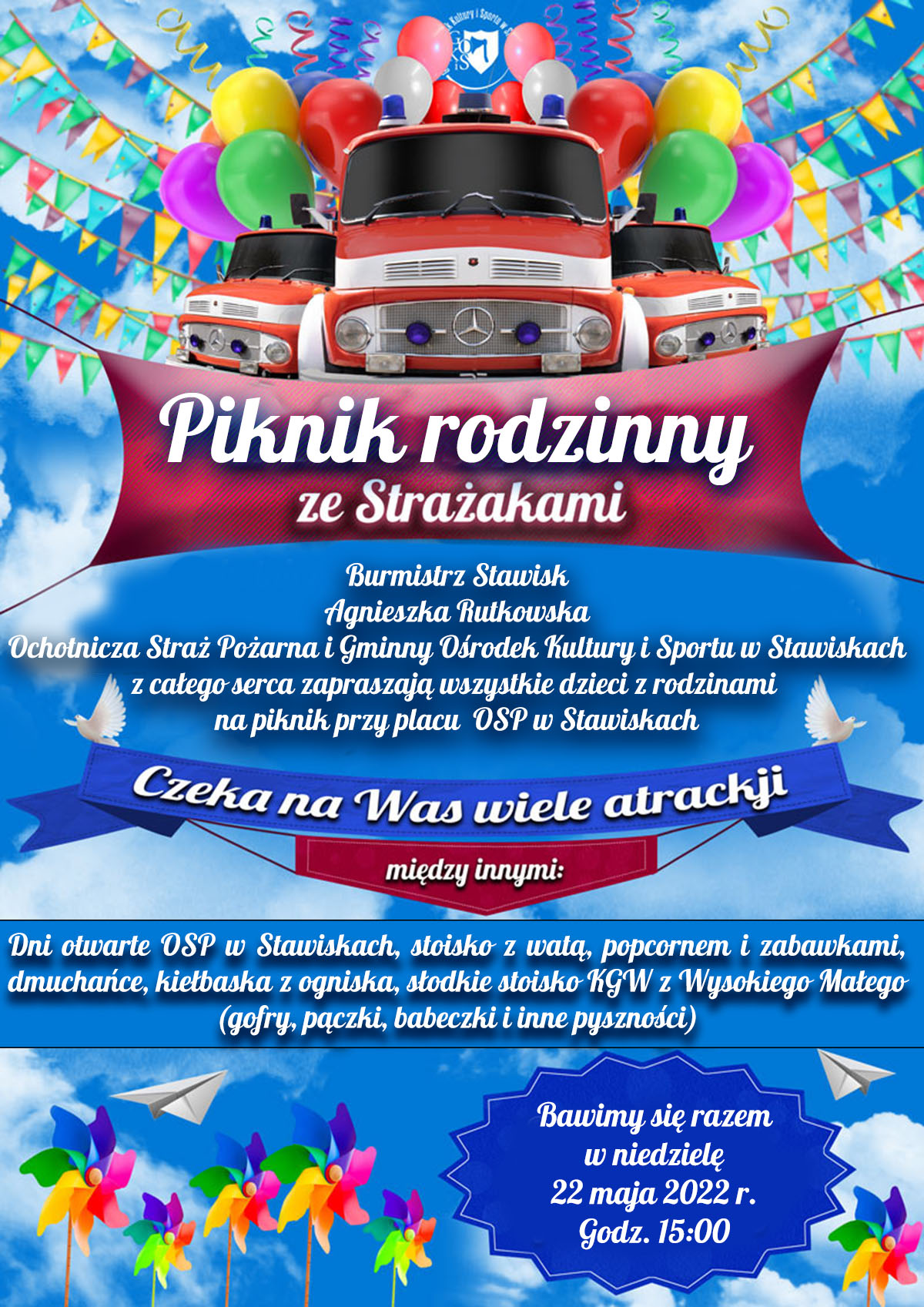 Burmistrz Stawisk Agnieszka Rutkowska, OSP w Stawiskach oraz GOKiS w Stawiskach z całego serca zapraszają na piknik ze Strażakami przy placu OSP w Stawiskach.